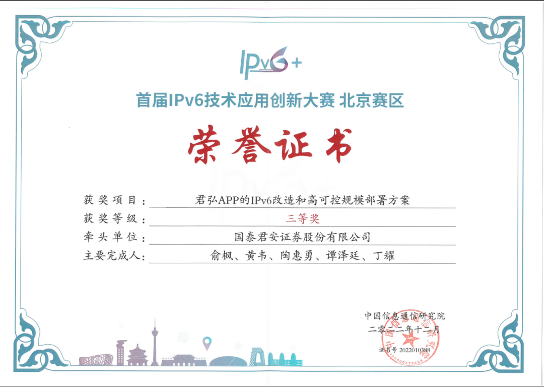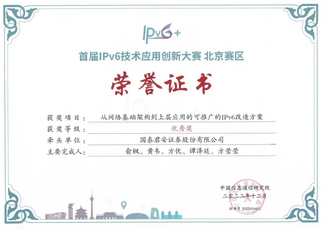 近日,首届IPv6技术应用创新大赛北京赛区的赛事落幕,国泰君安凭借在IPv6改造和规模部署方面的丰富经验和技术成果,两项报送项目分别荣获北京赛区三等奖和优秀奖,成为唯一一家以独立自研改造获得两项荣誉的证券公司。