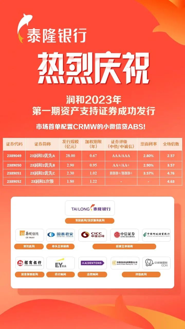 近日,由国泰君安证券牵头主承销的“润和2023年第一期微小企业贷款资产支持证券”(以下简称“润和2023-1”)在银行间债券市场成功发行。本项目由浙江泰隆商业银行股份有限公司(以下简称“泰隆银行”)担任发起机构,为市场首单配置信用风险缓释凭证的小微信贷ABS。