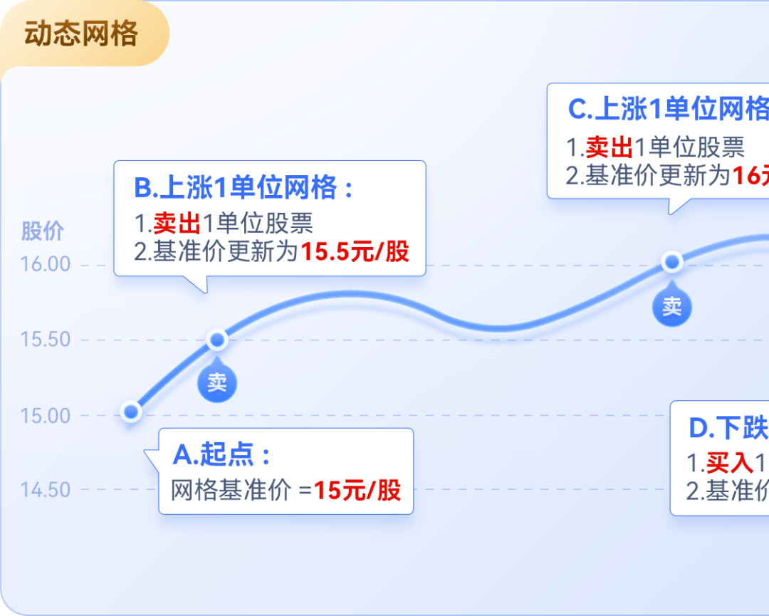 在基准价上下设定一系列目标价格,股价下跌触及目标价格时分批买入,上涨触及目标价格时分批卖出,每次成交会将基准价更新为新的触发格线价,再基于新的基准价和步长重新绘制网格,依据同样新的目标价格进行买卖操作。
