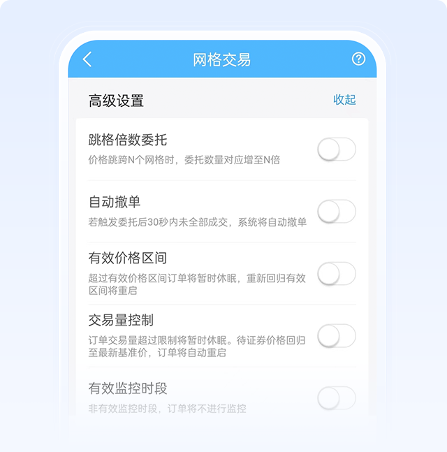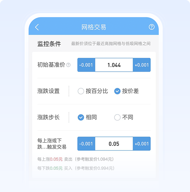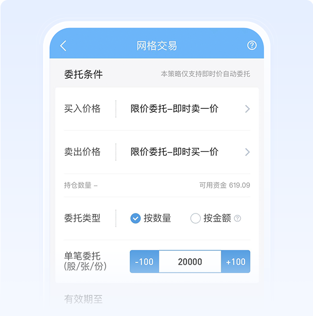 委托条件指股价每次触网后的委托数量、金额及价格,投资者可自定义按数量委托或按金额委托。