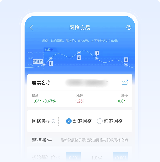 国泰君安君弘APP网格交易提供动态、静态两种网格交易模式,投资者可自由切换使用场景,助力在震荡行情中省心投资。