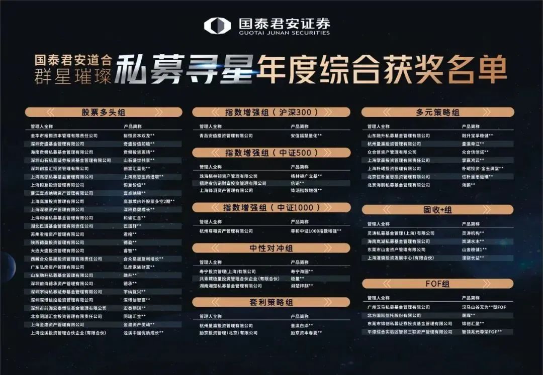 经过9个月的激烈角逐,由国泰君安主办的“国泰君安道合-群星璀璨-私募寻星”(2022赛季)活动圆满收官。近日,活动颁奖典礼在上海正式举行。共50只产品获奖,对应共计48家管理人获得“道合-群星璀璨-私募寻星”活动(2022赛季)优胜管理人。