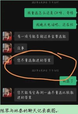 林泰表示,其是技术人员,股份来自于股权激励,并不了解证券投资。他所有的操作都是在陈琴的指导下完成。双方的聊天记录显示,在做风险评测时,陈琴让他“尽量选择c或者d答案,激进一点”。