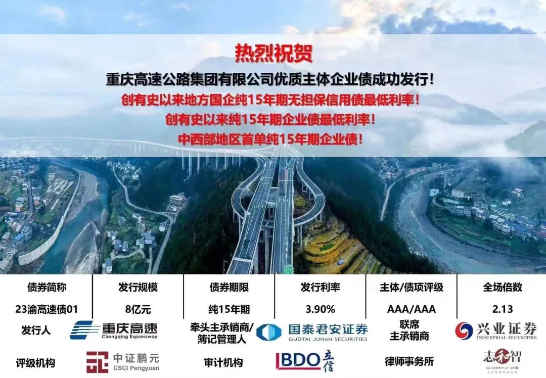 4月17日,重庆高速公路集团有限公司(简称“重庆高速”)成功簿记发行“2023年第一期重庆高速公路集团有限公司公司债券”(债券简称:23渝高速债01,债券代码:2380124),本期债券由国泰君安证券担任牵头主承销商、簿记管理人。本期债券实现了中西部地区纯15年期企业债零的突破,并创下有史以来地方国企纯15年期无担保信用债最低利率,以及创下有史以来纯15年期企业债最低利率。