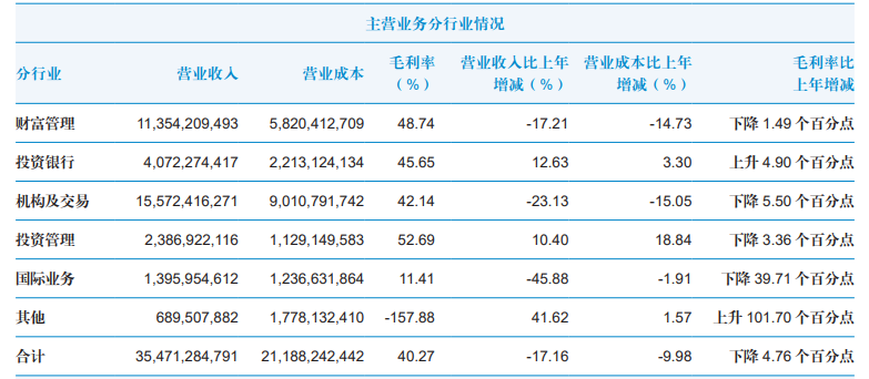 再来看创利数据,2022年,国泰君安投资银行条线毛利率为45.65%,同比上升5.50个百分点。此外,财富管理业务毛利率降幅也较低,下降1.49个百分点。