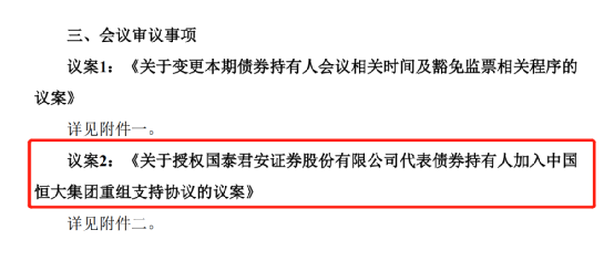 在2022年,国泰君安就曾主持召开了两次债券持有人会议。4月21日,“15恒大03”又公告,将于本月26日召开持有人会议,审议授权国泰君安代表债券持有人,加入中国恒大集团重组支持协议等议案。