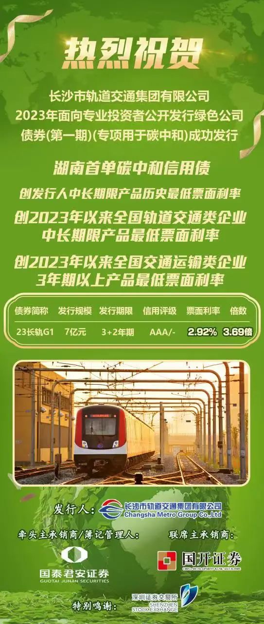 4月25日,由国泰君安证券担任牵头主承销商和簿记管理人,长沙市轨道交通集团有限公司2023年面向专业投资者公开发行绿色公司债券(第一期)(专项用于碳中和)在深圳证券交易所成功发行。本期债券为湖南省首单碳中和信用债,发行规模7亿元,期限3+2年期,票面利率2.92%,全场有效认购倍数3.69倍。