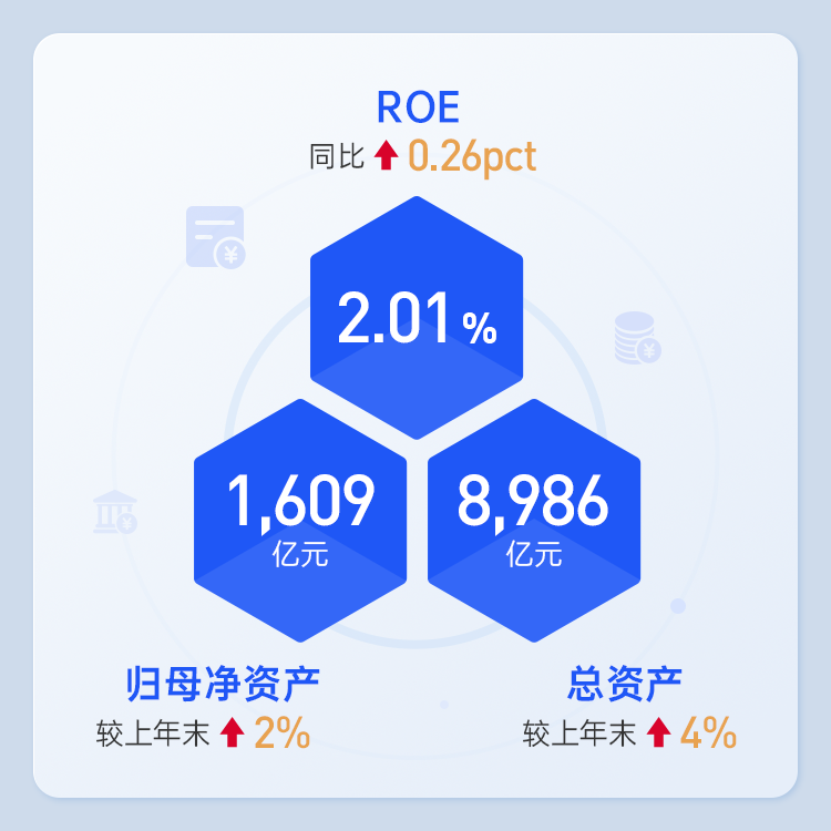 公司资产规模和盈利能力稳中有升,截至一季度末,公司总资产达8986亿元,较上年末增长4%,归母净资产达1609亿元,较上年末增长2%,加权平均净资产收益率2.01%,同比上升0.26个百分点。
