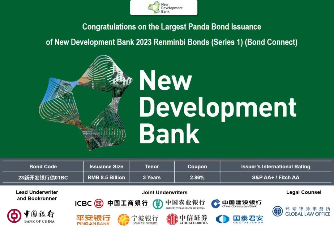 近日,国泰君安作为联席主承销商助力新开发银行2023年度第一期人民币债券(债券通)在银行间债券市场成功发行。本期熊猫债的发行人为新开发银行(New Development Bank),期限为3年期,票面利率为2.86%,发行规模为85亿元人民币,是迄今为止单笔规模最大的国际开发机构熊猫债。