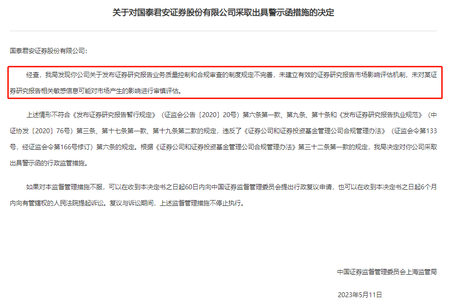 上海证监局表示,国泰君安关于发布证券研究报告业务质量控制和合规审查的制度规定不完善,未建立有效的证券研究报告市场影响评估机制,未对某证券研究报告相关敏感信息可能对市场产生的影响进行审慎评估。根据《证券公司和证券投资基金管理公司合规管理办法》第三十二条第一款的规定,决定对国泰君安采取出具警示函的行政监管措施。