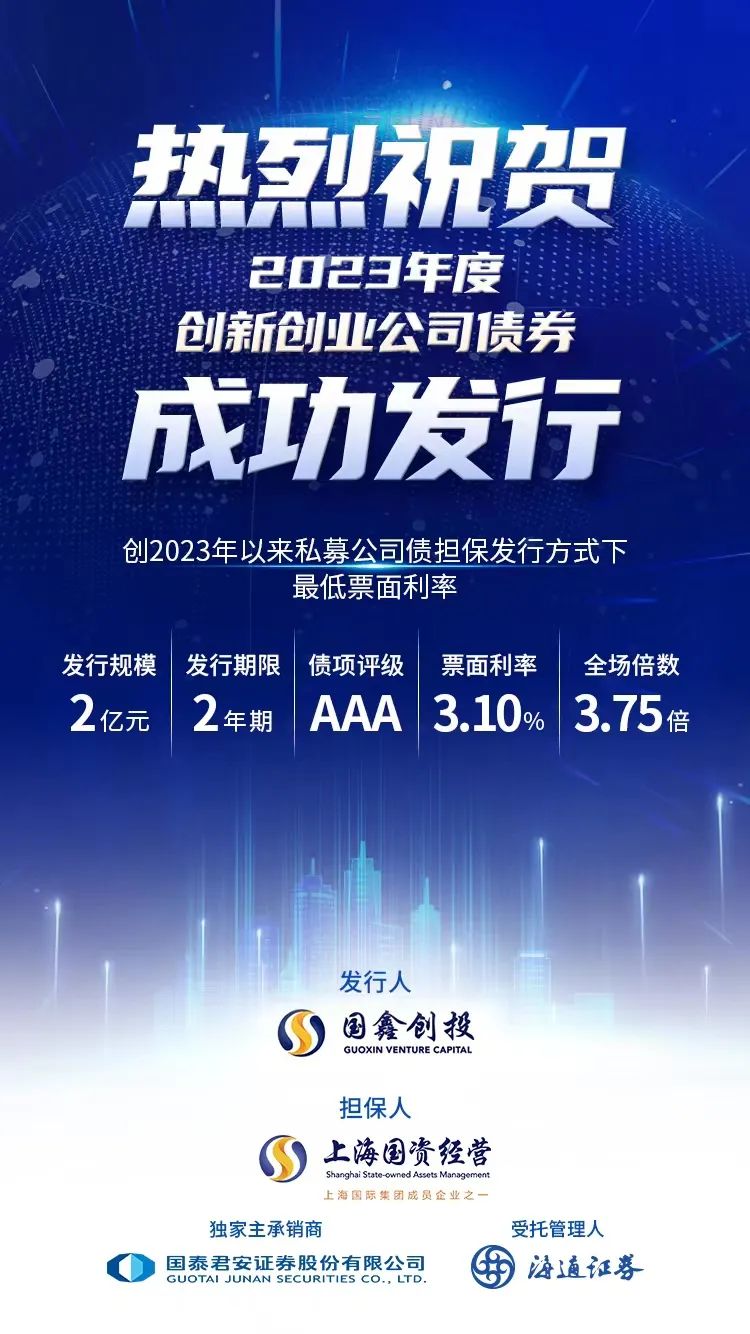 近日,上海国鑫创业投资有限公司(简称“国鑫创投”)2023年面向专业投资者非公开发行创新创业公司债券(第一期)(债券名称:23国鑫01)在上海证券交易所成功发行,该债券由国泰君安担任独家主承销商。本期债券发行规模2亿元,期限2年期,票面利率3.10%,由上海国有资产经营有限公司提供担保,募集资金主要用于支持创新创业企业发展。