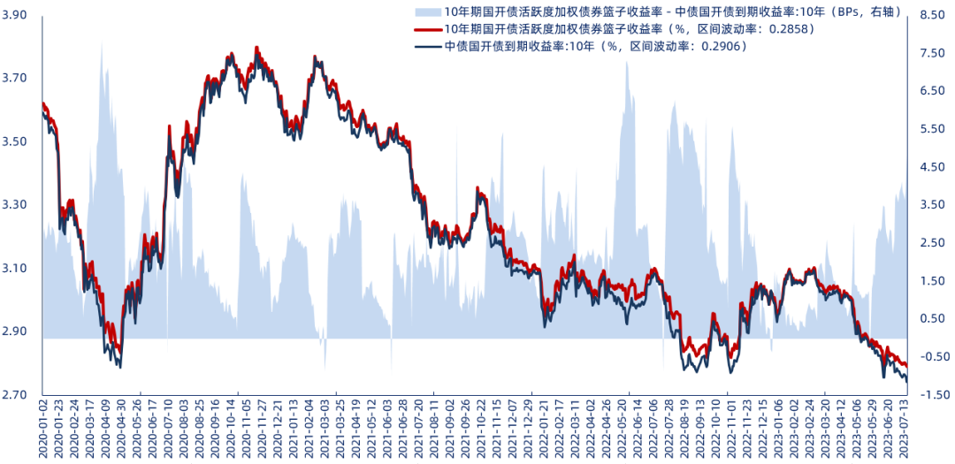 图一:10年期国开债活跃度加权债券篮子收益率与中债国开债到期收益率:10年比较(2020-01至2023-07)