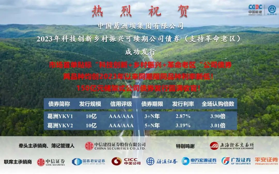 8月16日,国泰君安助力中国葛洲坝集团有限公司2023年面向专业投资者公开发行科技创新乡村振兴可续期公司债券(支持革命老区)成功发行。本期债券为市场首单“科技创新+乡村振兴+革命老区”三贴标公司债券,发行规模20亿元,3+N年期品种票面利率2.87%,全场认购倍数3.90倍;5+N年期品种票面利率3.19%,全场认购倍数3.01倍。两个品种发行利率均创2023年以来全市场同期限同品种债券新低。