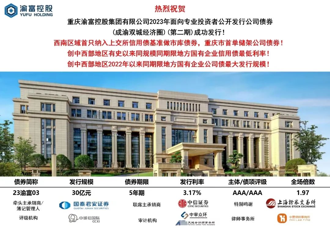 近日,重庆渝富控股集团有限公司(简称“渝富集团”)成功簿记发行“重庆渝富控股集团有限公司2023年面向专业投资者公开发行公司债券(成渝双城经济圈)(第二期)”(债券简称:23渝富03,债券代码:115904),国泰君安担任该项目牵头主承销商、簿记管理人。本期债券是西南区域首只纳入上交所信用债基准做市库债券,也是重庆市首单储架公司债券,创中西部地区同规模同期限地方国有企业信用债历史最低利率,同时创中西部地区2022年以来同期限地方国有企业公司债最大发行规模。