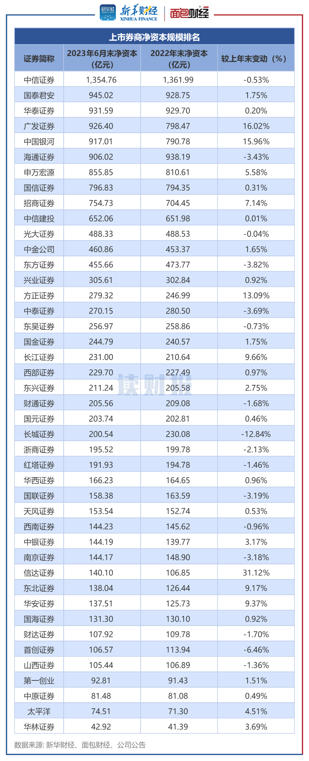 截至2023年6月末,国泰君安、华泰证券、广发证券等5家券商的净资本规模均超过900亿元。其中,广发证券、中国银河的增幅较大,分别较上年末增加16.02%和15.96%。