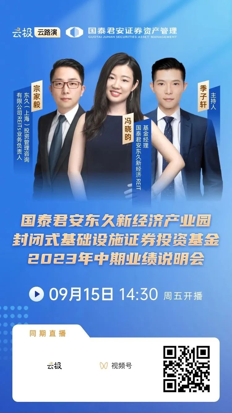 9月15日(星期五)国泰君安资管直播间,国泰君安东久新经济REIT基金经理冯晓昀、东久(上海)投资管理咨询有限公司REITs业务负责人宗家毅将为大家倾情讲解,不见不散!