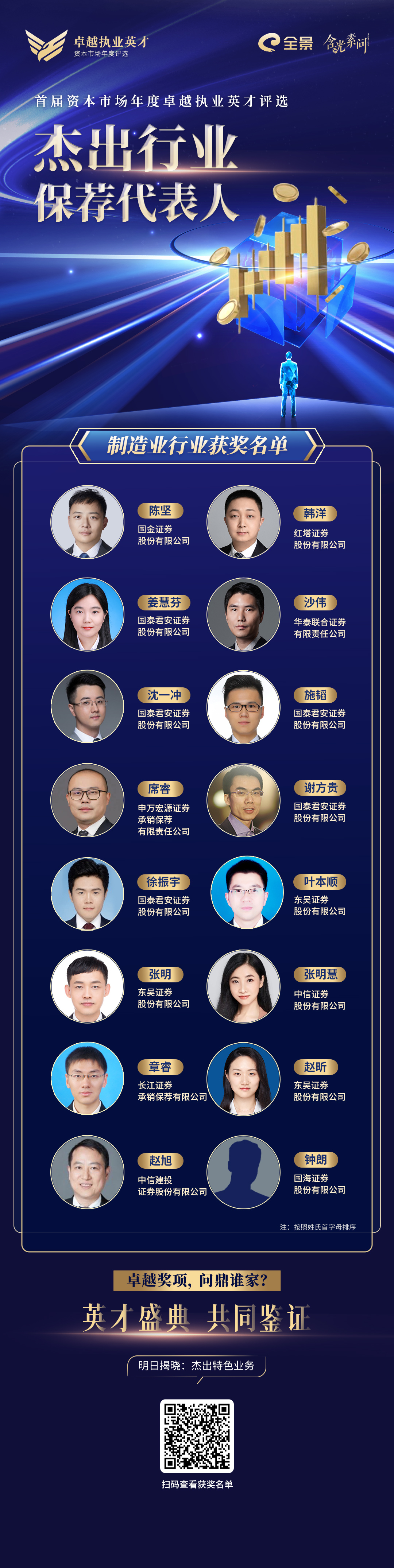 继“杰出行业保荐代表人-新能源”榜单之后,国泰君安在“杰出行业保荐代表人-制造业”获奖名单中再传捷报,施韬、沈一冲、谢方贵、徐振宁、姜慧芬共5位保荐代表人凭借其出色表现位列其中。此外,还有11位获奖人分别来自中信证券、国金证券、东吴证券、国海证券、中信建投证券、华泰联合证券、长江证券、申万宏源证券及红塔证券。