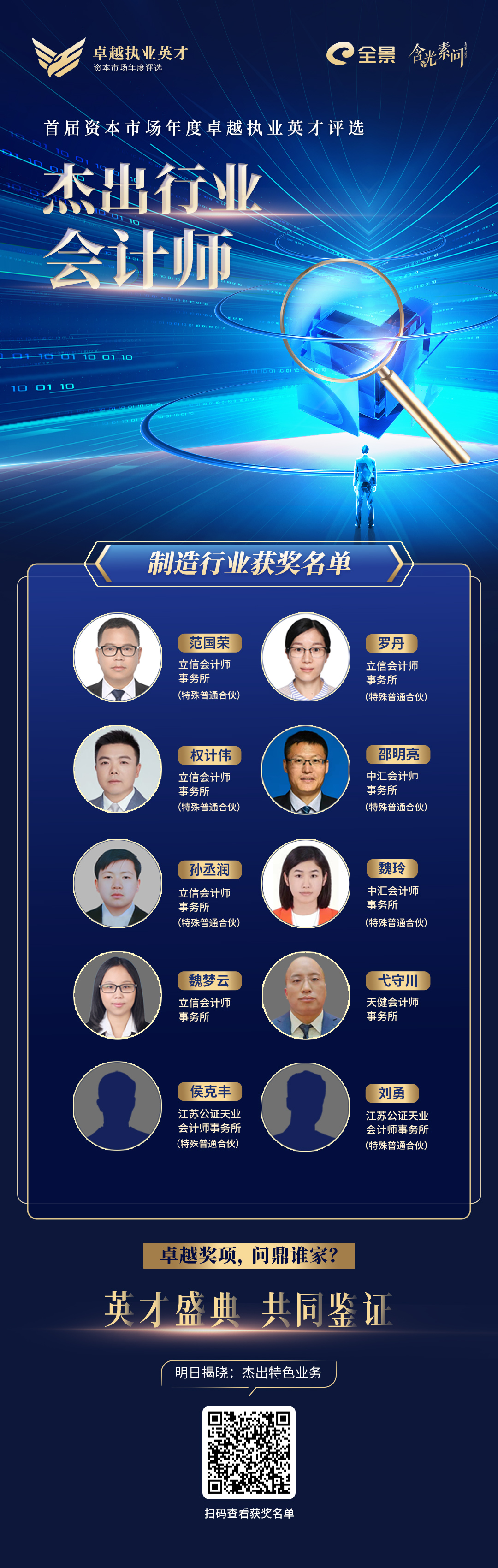 12月5日,首届“资本市场年度卓越执业英才评选”公布两大奖项获奖名单,“杰出行业保荐代表人-制造业”共16人上榜,“杰出行业会计师-制造业”共10人上榜!