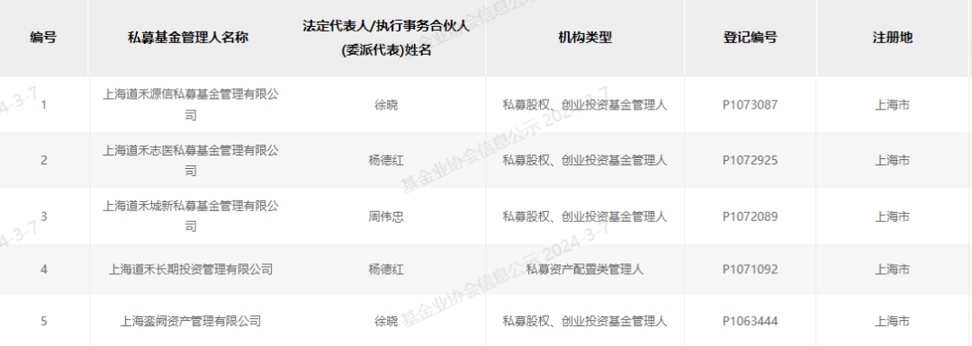 中基协显示,杨德红担任实控人的私募机构共有六家,并且互为关联方。除上海道禾外,均为股权创投类私募机构。