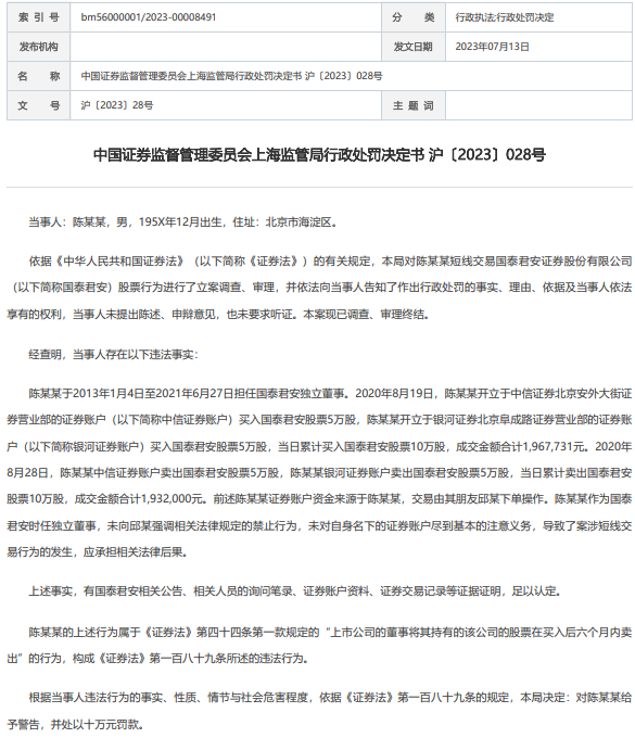 罚单显示,当事人陈某某于2013年1月4日至2021年6月27日担任国泰君安独立董事。2020年8月19日,其名下两个证券账户累计买入国泰君安股票10万股,成交金额合计1,967,731元。2020年8月28日,累计卖出国泰君安股票10万股,成交金额合计1,932,000元。经查,前述证券账户资金来源于陈某某本人,交易由其朋友邱某下单操作。