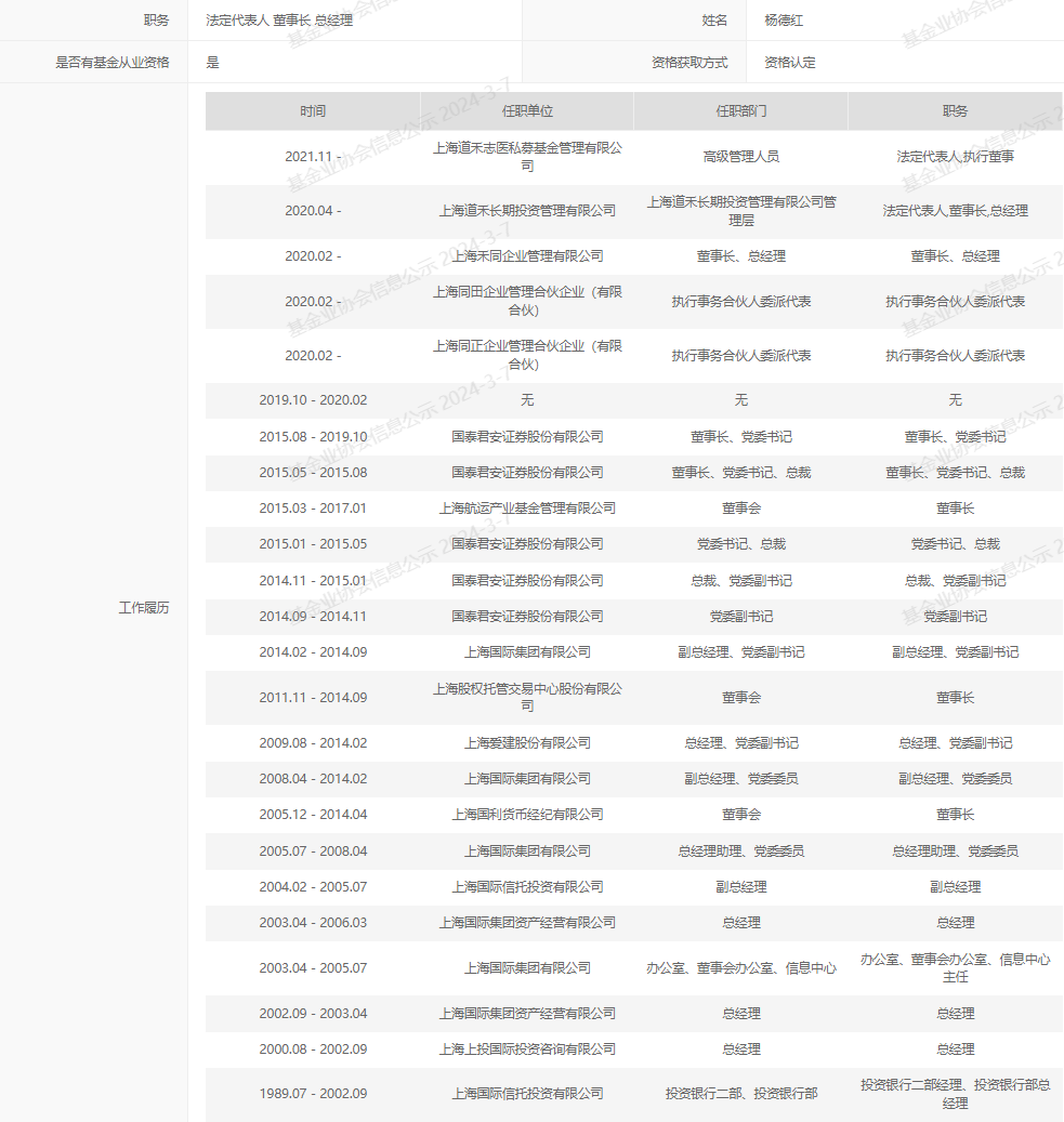 2015年5月,时任总裁杨德红先生出任国泰君安第四任董事长,并率队敲钟上市。2019年9月,杨德红卸任离职。在休息三个月后,他先后创设和参股了包括上海禾同企业管理有限公司(简称:上海禾同)在内的多机构,并担任高管。2020年4月,由上海禾同间接控股的上海道禾长期投资管理有限公司(简称:上海道禾)创立;同年7月备案为“私募资产配置类管理人”。目前,上海道禾的管理规模为20-50亿元。