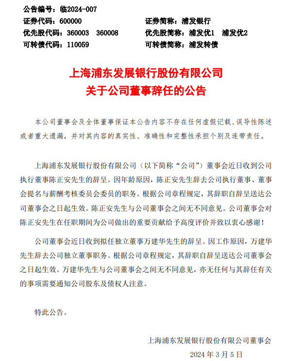 今年3月5日,浦发银行发布公告称,因年龄原因,陈正安先生辞去公司执行董事、董事会提名与薪酬考核委员会委员的职务。“根据公司章程规定,其辞职自辞呈送达公司董事会之日起生效”。浦发银行表示,“陈正安先生与公司董事会之间无不同意见。公司董事会对陈正安先生在任职期间为公司做出的重要贡献给予高度评价并致以衷心感谢”!