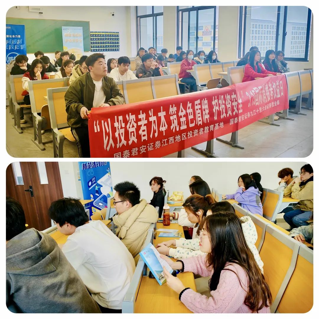 为切实提升在校学生金融素养,有效防范化解金融风险,积极响应中国证券业协会“投资者教育进百校”的倡议,营造和谐健康的金融环境,2024年3月15日,在江西证监局、江西省证券期货业协会、国泰君安证券总部投教基地指导下,国泰君安证券江西地区投教基地联合九江十里大道营业部走进江西财经职业学院八里湖校区开展3.15国际消费者权益日主题投教宣传活动。