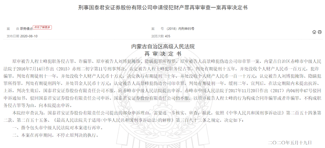 正是这起案件,国泰君安向内蒙古高院申诉,主张程某峰的行为构成合同诈骗罪或者诈骗罪,不构成职务侵占罪。内蒙古高院于2020年5月下发下发了(2018)内刑申85号再审决定书,指令包头市中级人民法院对本案进行再审。