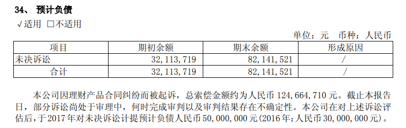 2017年报同样显示,因理财产品合同纠纷被起诉,总索偿金额约为124,664,710元。截止本报告日,部分诉讼尚处于审理中,何时完成审判以及审判结果存在不确定性。在对上述诉讼评估后,于2017年对未决诉讼计提预计负债5000万元。