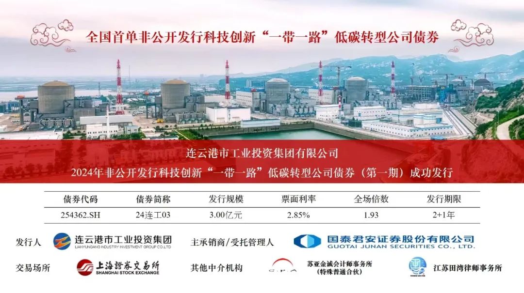 4月16日,由国泰君安担任独家主承销商的连云港市工业投资集团有限公司(以下简称“连云港工投”)2024年非公开发行科技创新“一带一路”低碳转型公司债券(第一期)完成簿记工作,发行规模3亿元,发行期限2+1年期,票面利率2.85%,为全国首单非公开发行科技创新“一带一路”低碳转型公司债券。