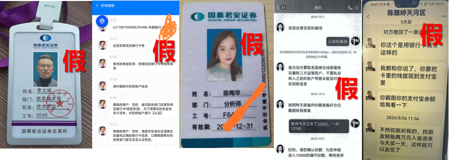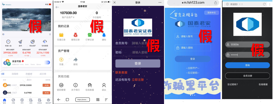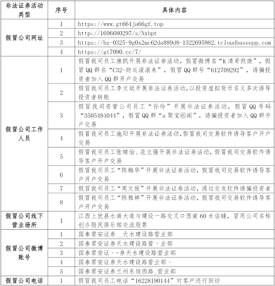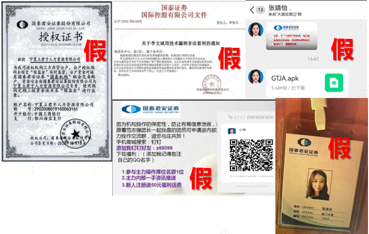 近期,国泰君安证券股份有限公司(以下简称“我司”)发现有不法分子假冒我司名义,通过电话、微信、QQ群等渠道,诱导投资者下载伪造的我司APP,诱导投资者点击伪造的我司网址进行转账。