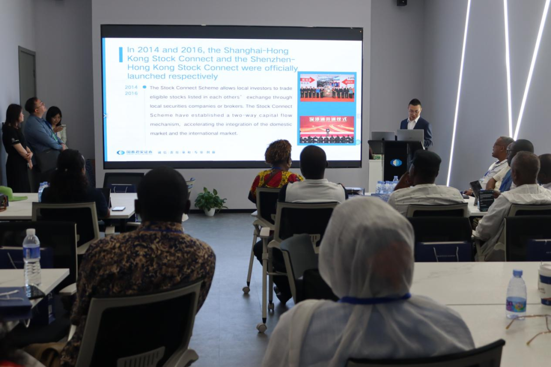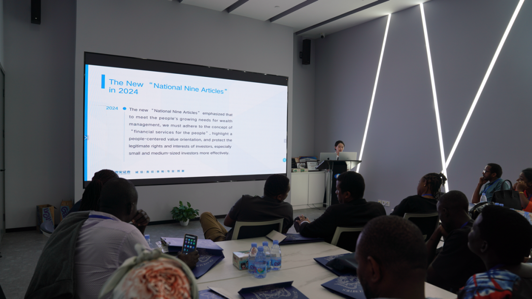 参观结束后,国泰君安专家讲师为代表团成员带来了《中国特色资本市场概览》分享,介绍了中国资本市场背景,回顾了中国证券市场的发展,介绍了现在中国资本市场的情况,特别分享了新“国九条”政策的意义。
