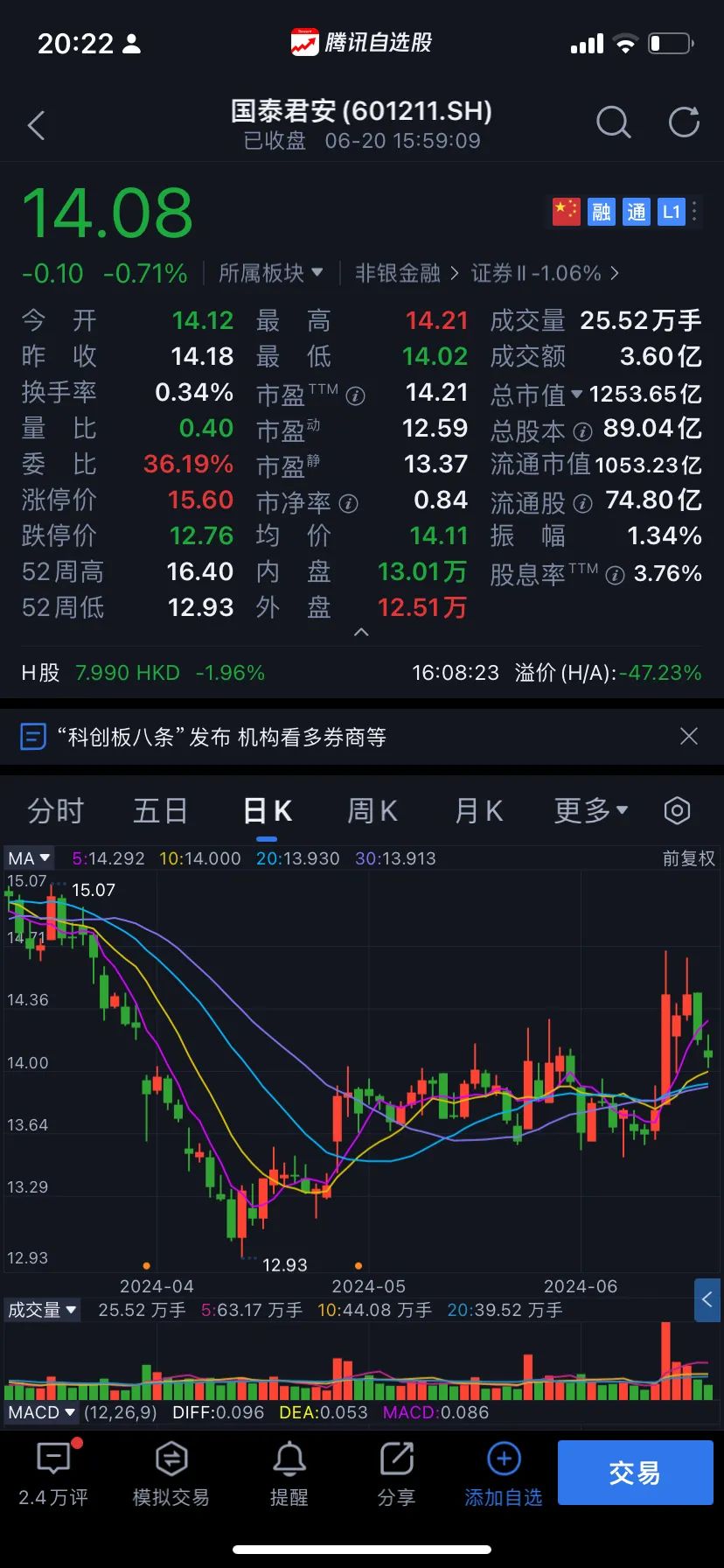 截至6月20日收盘,国泰君安收报14.08元/股,较前一交易日微跌0.71%,总市值1253.65亿元。