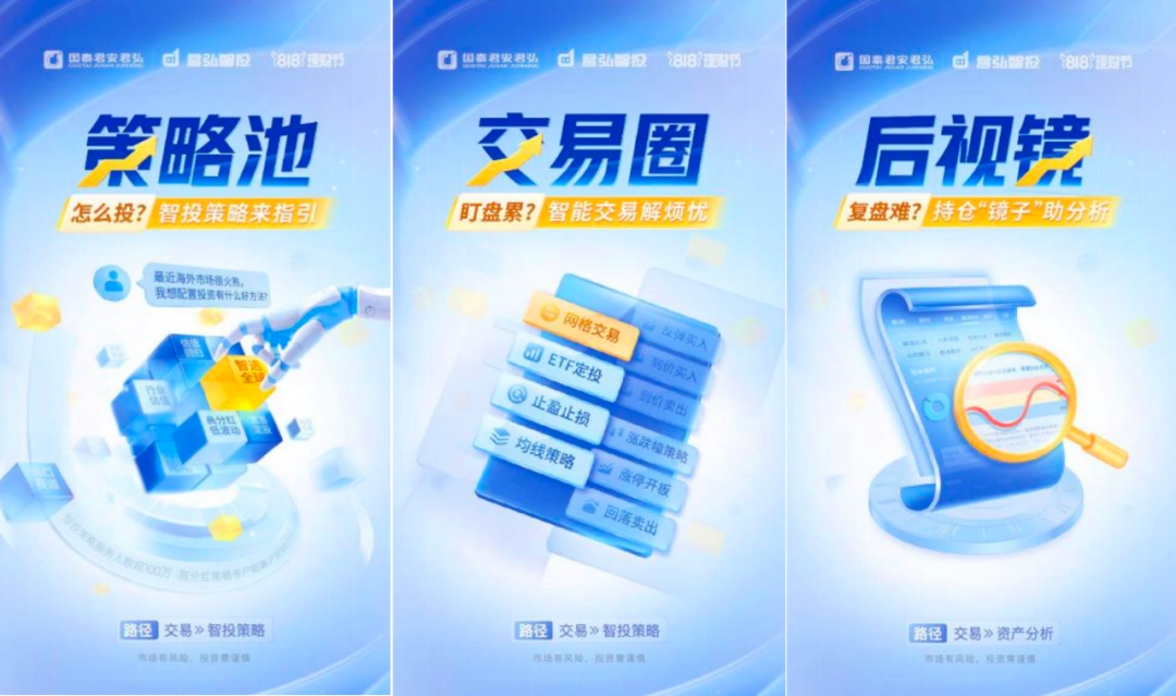 持续建设君弘智投服务体系,服务海量客户解决投资理财难题。国泰君安围绕“投资中国、长期持有、科学配置、理性理财”的投资哲学,持续建设君弘智投服务体系,落地推广投资哲学、投教课程、投资工具、线上投顾、投资社区、成长体系、组织体系、推广体系八大子体系,通过覆盖投前、投中、投后全生命周期的陪伴式投顾服务,助力投资者拉长投资久期,提升投资胜率。818理财节期间,君弘智投升级推出11大工具化投资策略,为不同风险偏好的客户提供高分红低波动、估值回归、风口赛道等投资策略,支持客户以长期投资、趋势轮动、止盈定投等方式投资股票、ETF、基金等投资品种,并提供涵盖投资辅助决策工具、明星投顾产品、精选增值资讯等专业化辅助服务。君弘智投坚持投教先行,推出君弘智投系列投教课程,面向不同投资对象、细分不同投教场景形成涵盖“知识+产品+策略+交易”的多样化投教内容体系,通过数字化平台为各类投资者提供多样化投教服务,助力投资者以长期投资把握A股时代机遇。