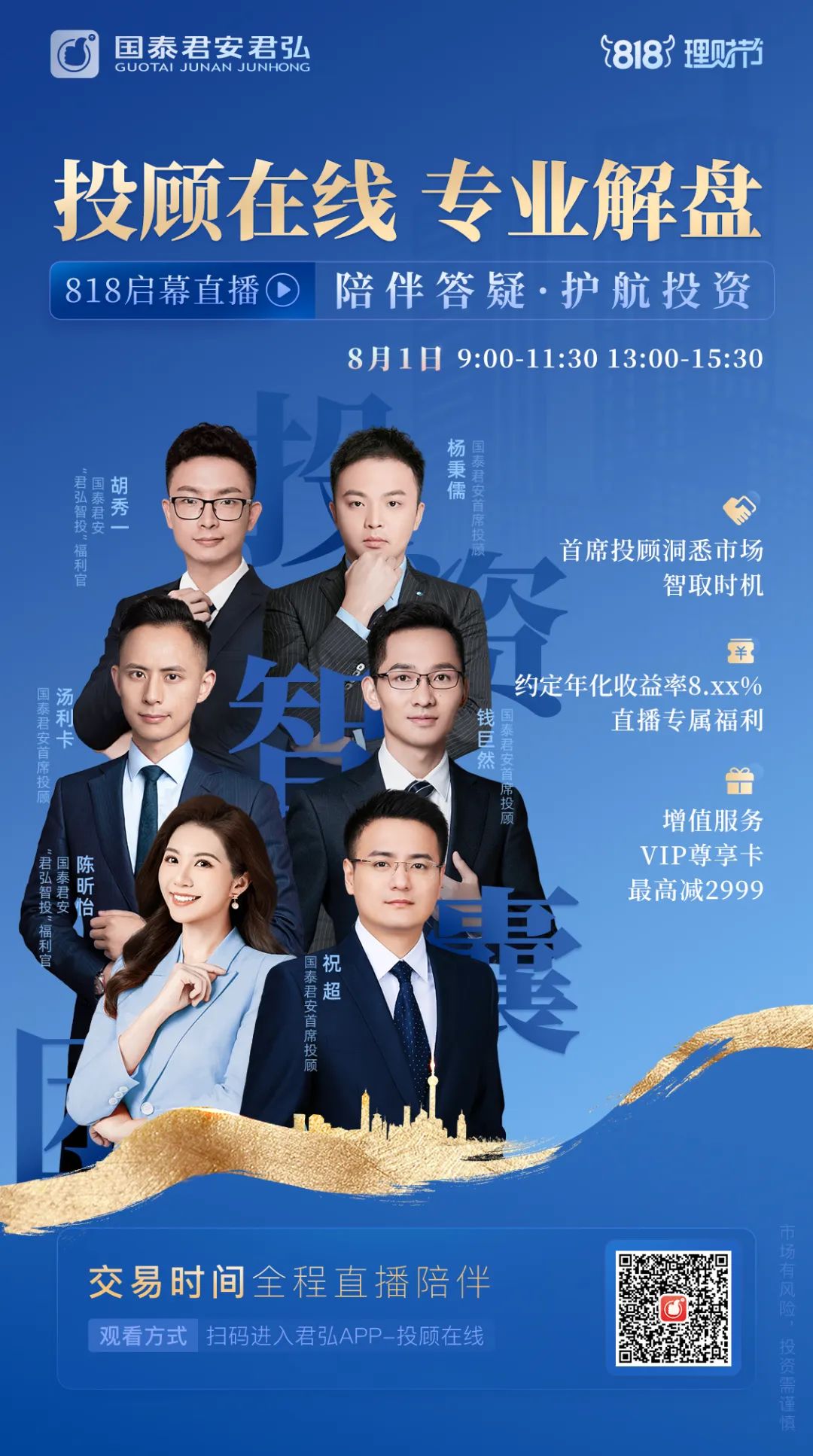 国泰君安818理财节全新升级直播陪伴服务,全天候护航投资。“投顾在线”投顾陪伴式解盘直播818理财节期间全新升级,新增晚间直播时段,由交易时间直播解盘升级为全天候直播陪伴,首席投顾追踪热点实时解盘,晚间专题复盘分析,加强直播互动答疑,助力把脉市场投资逻辑,以专业服务强化客户对财富管理平台和服务的连接与信任。基于国泰君安“三大金才”投顾队伍建设,君弘APP视频直播板块搭建投资者与首席投顾在线交流的窗口,打造《首席有约》《首席说》《超人说》《机构面对面》《谈指论基》等王牌节目,致力于以最专业的声音,触达客户最关心的热点,解决客户最迫切的投资理财需求痛点。