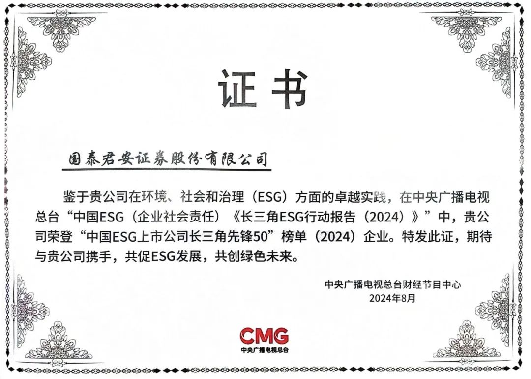 8月7日,中央广播电视总台财经节目中心《长三角ESG行动报告(2024)》在ESG中国·长三角企业社会责任发布会上正式对外发布,国泰君安凭借近年来在ESG领域的良好表现成功入选“中国ESG上市公司长三角先锋50”榜单(2024)。