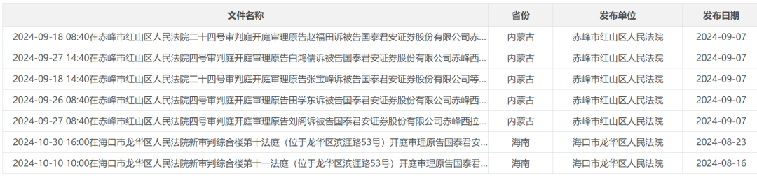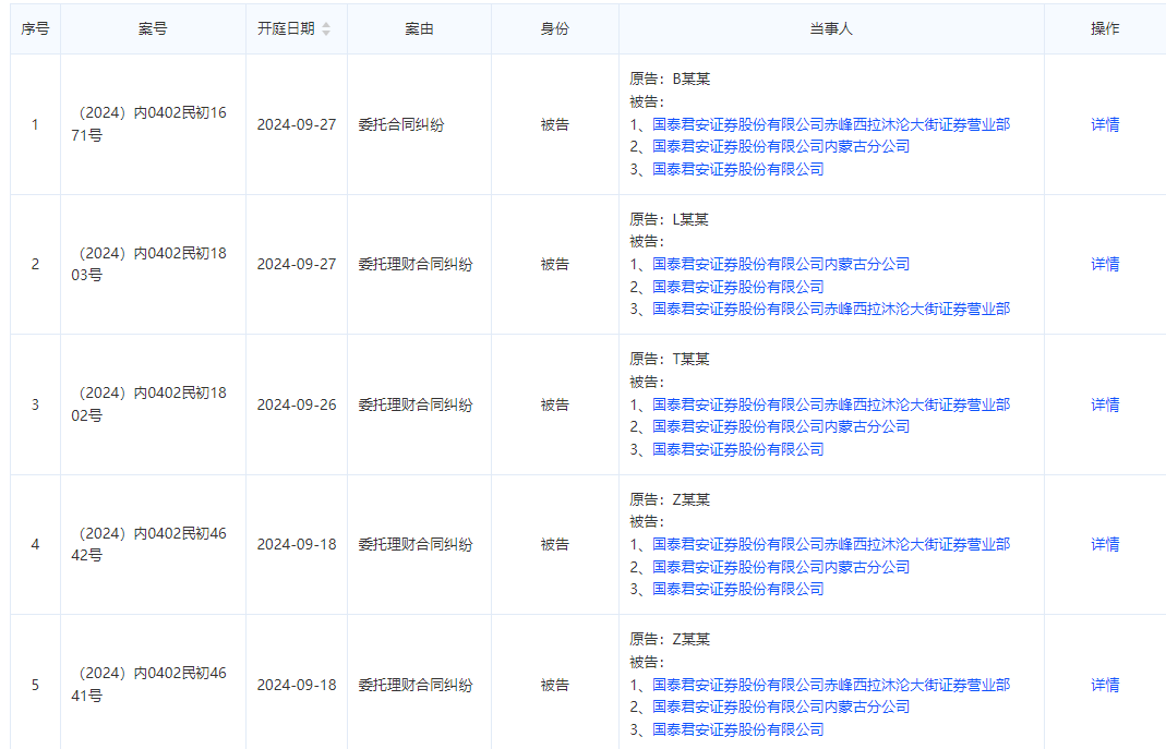 对照企查查和启信宝等收录的涉诉信息,以上五起案件的被告均为国泰君安及旗下内蒙古分公司和赤峰营业部。而原告方同样出现在今年年初裁判文书网集中披露的“往期”案件中。