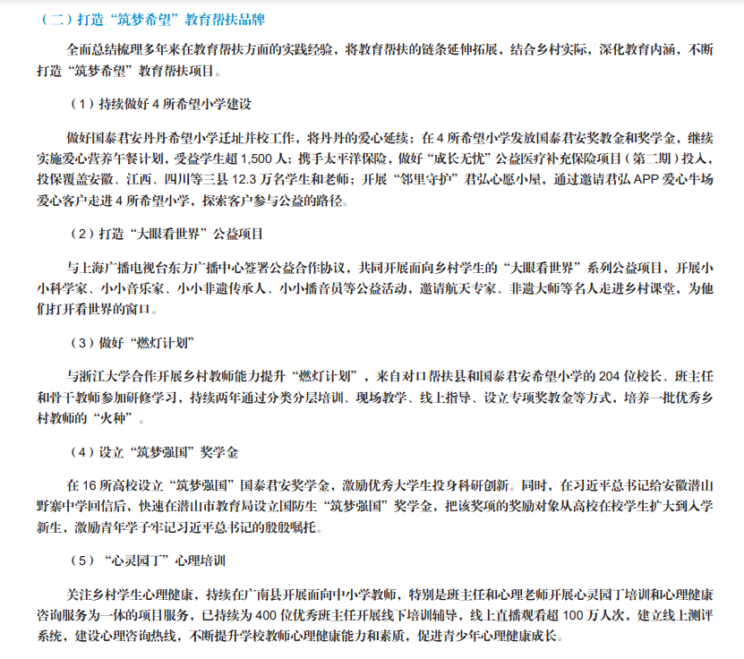 比如,在2023年报中,国泰君安以半页篇幅总结了多年来在教育帮扶反目的经验,尤其是对学校教师的帮助。