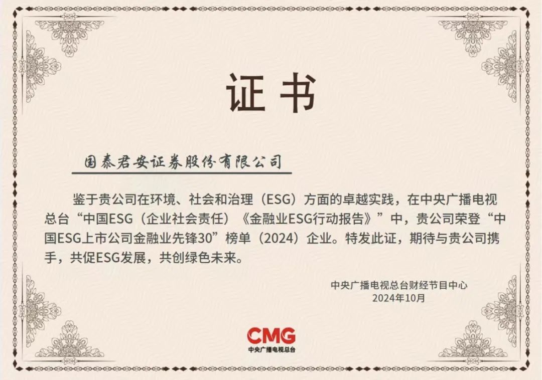 在中央广播电视总台近日发布的《金融业ESG行动报告(2024)》(简称《报告》)中,国泰君安成功入选“中国ESG上市公司金融业先锋30”榜单,这是国泰君安连续第二年入选该榜单。