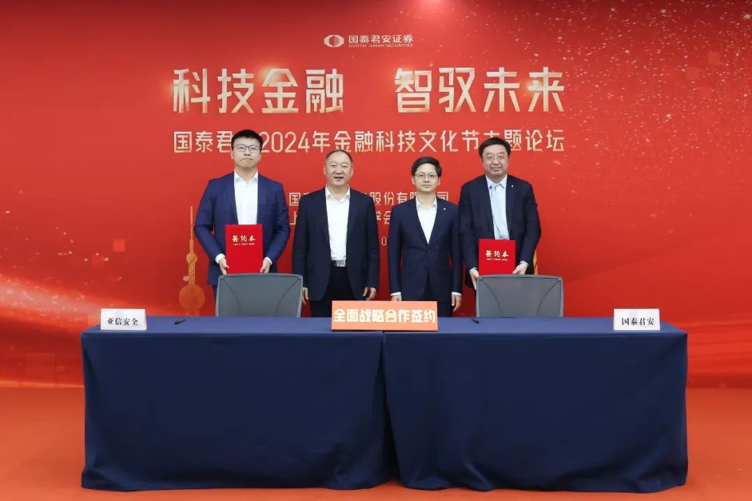 人工智能技术在金融领域的广泛应用,为金融证券行业的发展带来了新的活力,面对产业升级转型的态势,此次论坛围绕新兴技术赋能并影响金融科技发展的方方面面进行了探讨,同时围绕着金融科技的创新发展路径,联合产业中的各界力量,形成了共迎挑战、共赢发展的跨领域合作。作为此次活动的重要环节,亚信安全与国泰君安正式在会上签订全面战略合作协议,双方进一步深化前沿技术创新,共建共享生态合作圈,加强资本市场合作,并强化双方的人才交流与培养,让金融+安全的双动力模式在新变革中发挥更大效能。仪式上,亚信安全董事长何政与国泰君安总裁李俊杰出席并见证了双方深化合作的重要时刻,亚信安全CFO汤虚谷和国泰君安CIO俞枫代表双方公司签署了合作协议。
