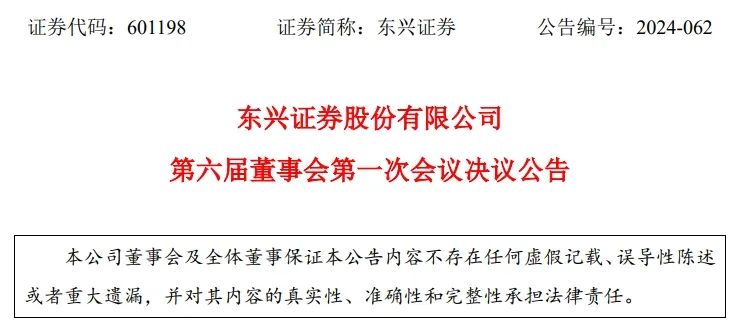 东兴证券股份有限公司(以下简称公司或东兴证券)第六届董事会第一次会议于2024年10月30日通过电子邮件方式发出会议通知,2024年10月30日在北京市西城区金融大街9号金融街中心18层第一会议室以现场及通讯方式召开,全体董事同意豁免本次会议的通知期限。本次会议应参与表决董事15名,实际参与表决董事共15名(其中:以通讯表决方式出席会议11人)。全体董事推选董事李娟女士主持会议,公司部分监事和高级管理人员列席会议。本次会议以记名投票方式进行表决,会议的召开及表决程序符合《公司法》及《东兴证券股份有限公司章程》的规定。本次会议表决通过了以下议案: