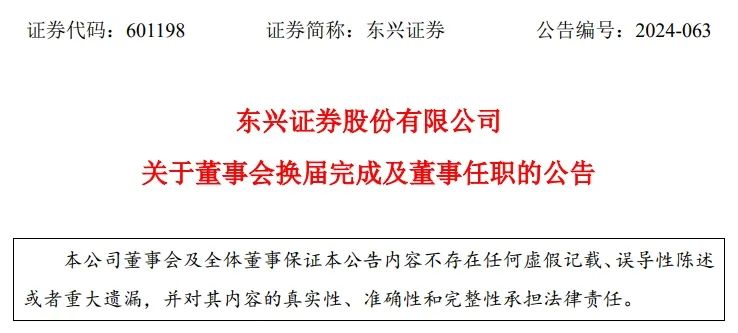 2024年10月30日,东兴证券股份有限公司(以下简称公司)召开2024年第三次临时股东大会(以下简称本次股东大会),审议通过了《关于选举公司第六届董事会非独立董事的议案》和《关于选举公司第六届董事会独立董事的议案》,选举李娟女士、牛南洁先生、张军先生、张芳女士、李珊女士、李鸣镝先生、李崴先生、张朝晖先生、周亮先生、张庆云女士为公司第六届董事会非独立董事;选举赖观荣先生、朱青先生、马光远先生、瞿晓燕女士为公司第六届董事会独立董事,上述董事共同组成公司第六届董事会。上述董事简历详见公司于2024年10月15日披露的《东兴证券股份有限公司2024年第三次临时股东大会会议文件》。上述董事自本次股东大会审议通过其任职议案之日起正式履职,任期三年,至公司第六届董事会届满。