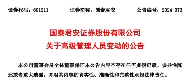 国泰君安证券股份有限公司(以下简称“公司”)董事会于近日收到张志红女士提交的书面辞呈,张志红女士因工作原因申请辞去公司总审计师职务,并向董事会确认其与董事会并无意见分歧,亦无其他因辞职而需知会股东的事宜,其辞职报告自送达公司董事会之日起生效。公司董事会对张志红女士任职总审计师期间为完善公司审计监督体系做出的不懈努力和卓越贡献表示衷心感谢!