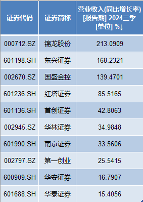 第一创业(002797)、国盛金控(002670)、锦龙股份、首创证券(601136)、华林证券(002945)、山西证券(002500)、华泰证券、南京证券(601990)等上市券商的前三季度净利润增幅,均超过了20%。