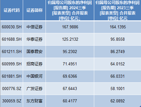 中国银河、广发证券、东方财富(300059)等前三季度净利润均超过60亿元,分别为69.64亿元、67.64亿元、60.42亿元。