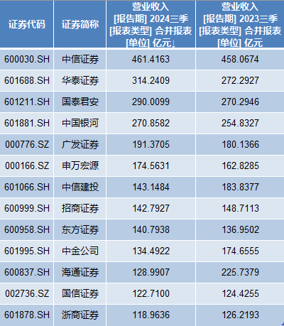 排名方面,中信证券(600030)以461.41亿元的营收规模蝉联第一,也是今年前三季度唯一一家营收超过400亿元的上市券商。