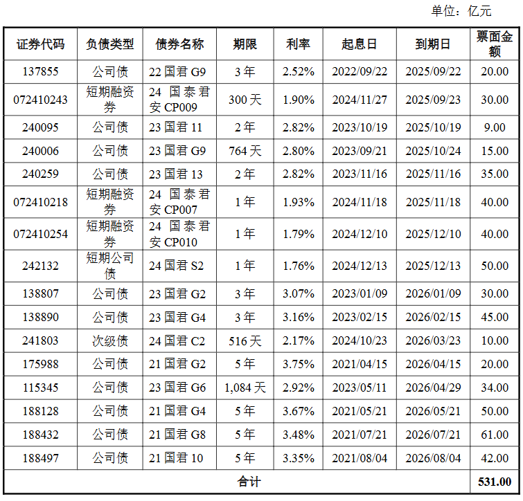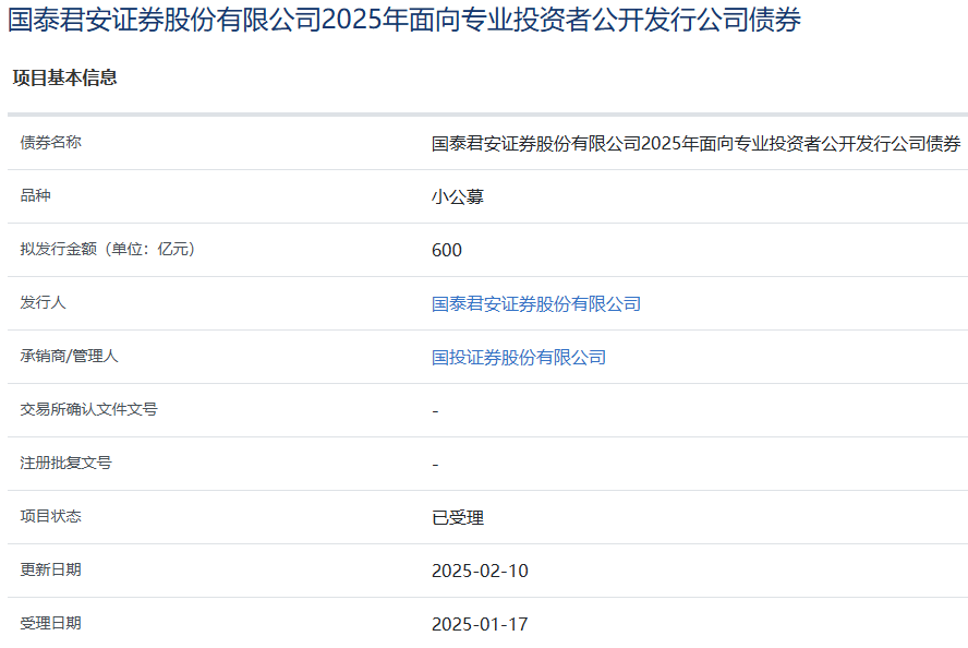 2月10日消息,国泰君安证券股份有限公司2025年面向专业投资者公开发行公司债券获上交所受理,该债券拟发行金额600亿元,品种为小公募,承销商/管理人为国投证券。