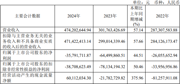 中国经济网北京4月18日讯纵横股份(688070.SH)昨日晚间发布2024年年度报告。2024年,公司实现营业收入4.74亿元,同比增长57.14%;归属于上市公司股东的净利润-3579.17万元,亏损同比减少44.51%;归属于上市公司股东的扣除非经常性损益的净利润-3870.86万元,亏损同比减少50.46%;经营活动产生的现金流量净额为6011.20万元,上年同期为-2178.27万元。