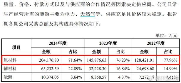 相比这些大家都看得到表面数据,力场君更关注一些细节,比如根据招股书披露,公司在2022年到2024年采购的原材料金额分别为12.84亿元、14.59亿元和20.42亿元,三年合计47.85亿元。