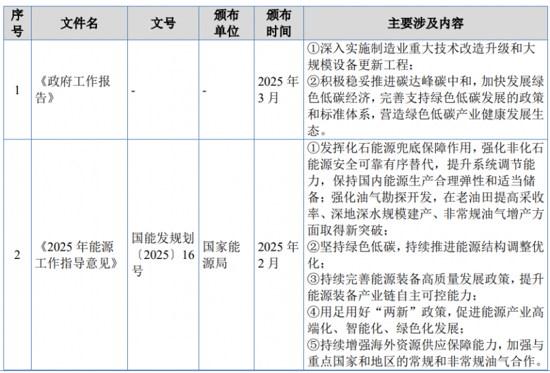 国家能源局《2025年能源工作指导意见》也指出,发挥化石能源兜底保障作用,强化非化石能源安全可靠有序替代,提升系统调节能力,保持国内能源生产合理弹性和适当储备;强化油气勘探开发,在老油田提高采收率、深地深水规模建产、非常规油气增产方面取得新突破;用足用好“两新”政策,促进能源产业高端化、智能化、绿色化发展;持续完善能源装备高质量发展政策,提升能源装备产业链自主可控能力。